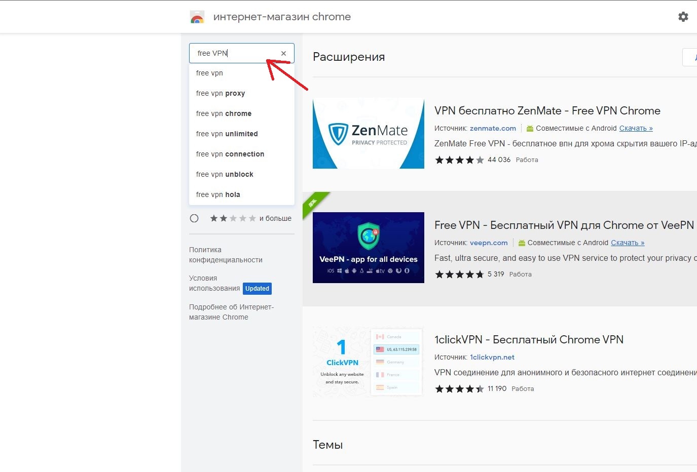 4. В поисковую строку введите free VPN.